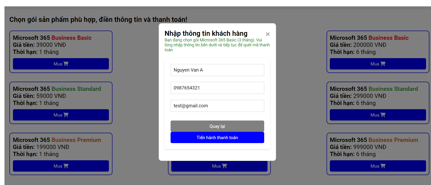 Tiến hành chọn gói & để lại thông tin. Vui lòng nhập chính xác thông tin