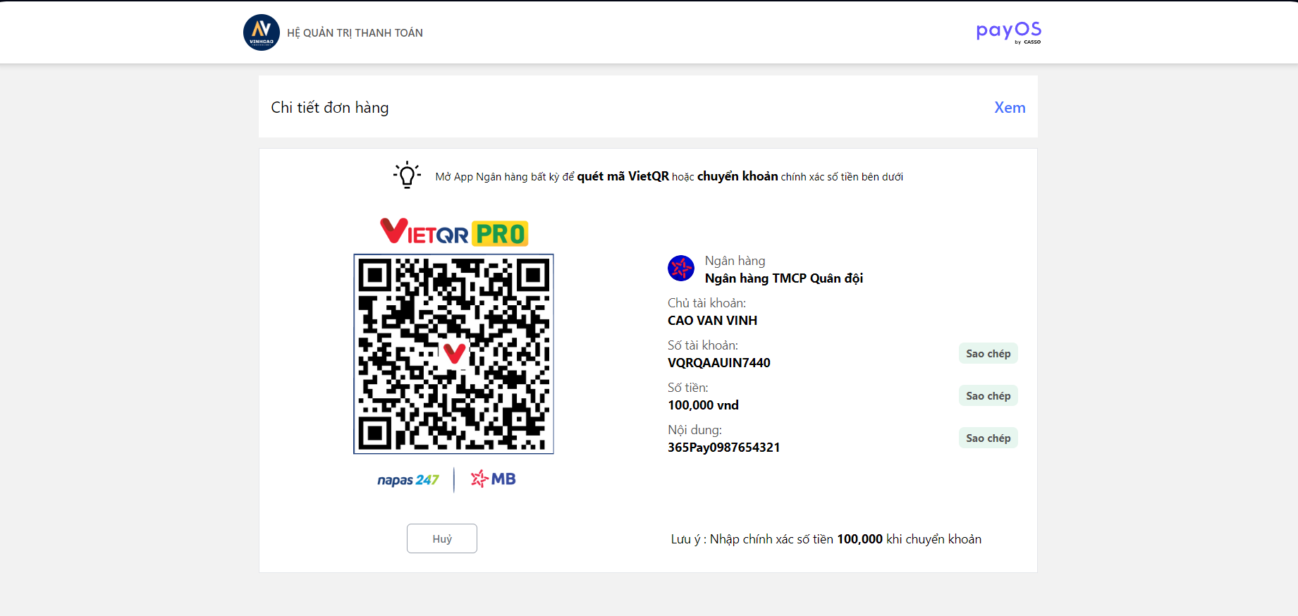 Tiến hành thanh toán với cổng thanh toán điện tử, mở App Ngân hàng để tiến hành quét mã được hiển thị trên màn hình hoặc chuyển khoản với các thông tin được hiển thị.