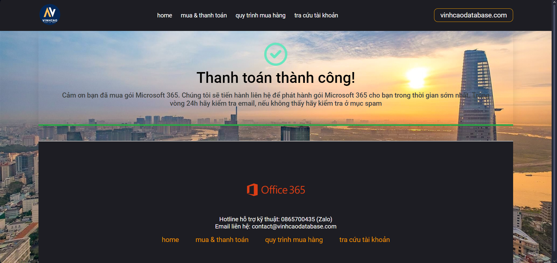 Sau khi thanh toán, hệ thống xác nhận thanh toán thành công. Chúng tôi sẽ liên hệ với bạn trong vòng 24h để tiến hành phát hành tài khoản và hỗ trợ cài đặt phần mềm cho bạn.
